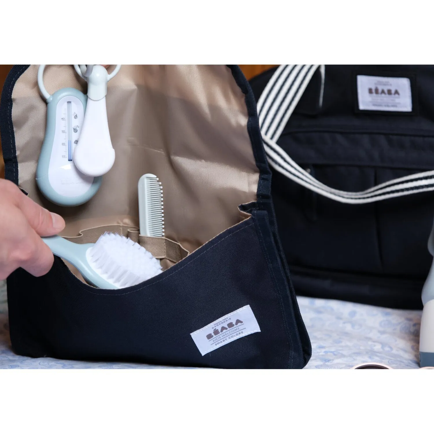 Composé d’un thermomètre de bain, d’un coupe-ongles et d’un peigne-brosse. Chaque élément de ce set a été soigneusement sélectionné pour répondre aux besoins essentiels de votre bébé. Pratique et astucieux, tous les accessoires sont accrochés sur un anneau avec mousqueton, ce qui facilite leur utilisation et leur rangement. Fini les objets égarés et les moments de stress ; tout est à portée de main pour prendre soin de votre bébé en toute simplicité.